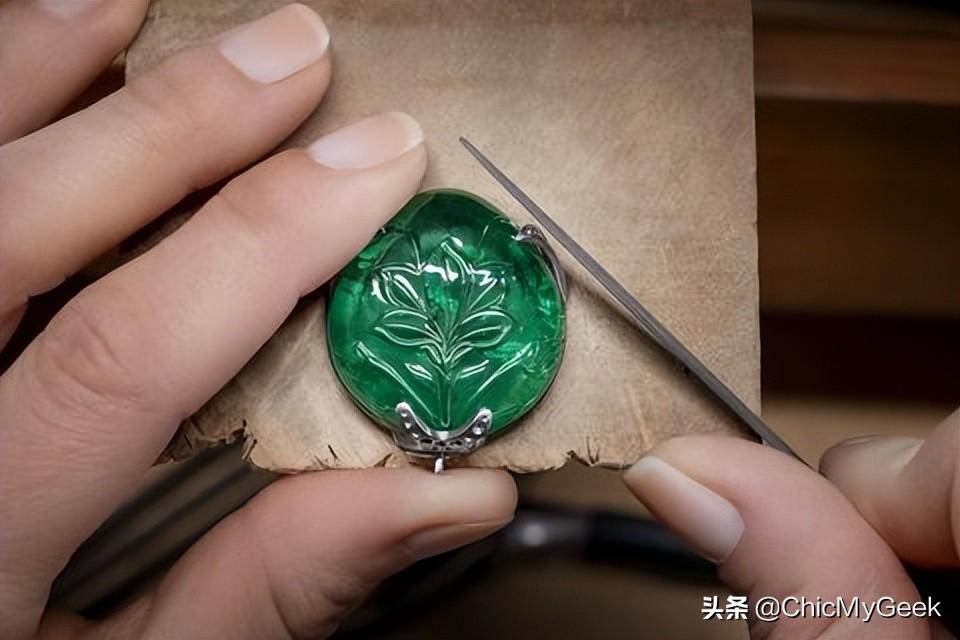 以独特的雕花设计,铭刻出盛开的悠然莲花,有两位工匠专责宝石的手工镶嵌,与周围璀璨钻石的搭配更是令人目眩神迷!
