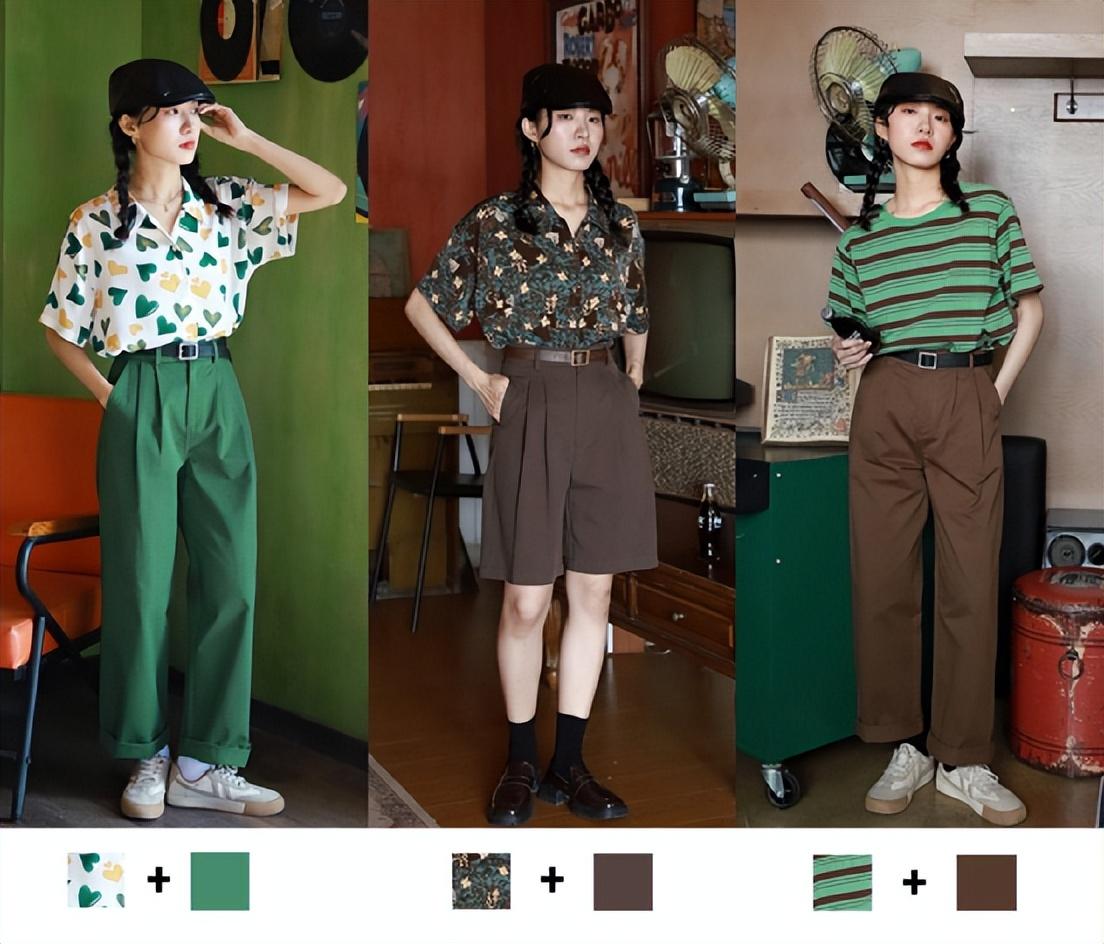 像夏季单品本身比较少,色彩呼应一般都是上下半身的呼应,夏季一般上衣的元素较为丰富,下半身的裤子则从上衣的印花中找出来一个颜色,搭配起来就很和谐。