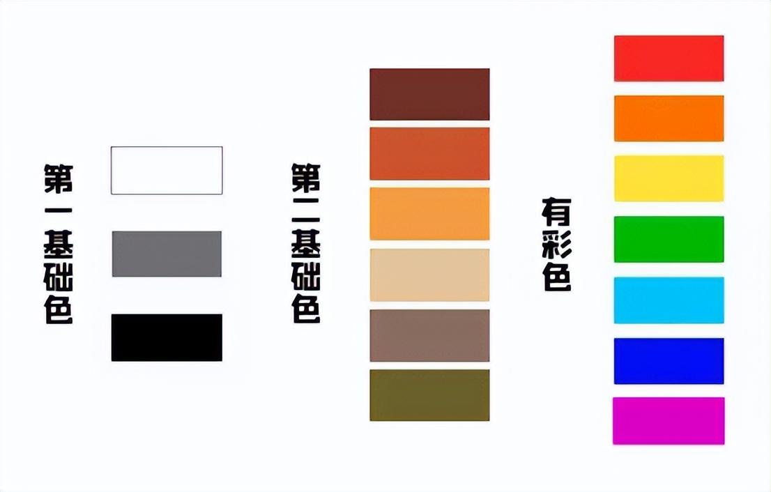 首先基础的是黑白灰,这种在理论中属于无彩色,没有色彩倾向,和任何其他颜色都能搭配,这种属于第一基础色。