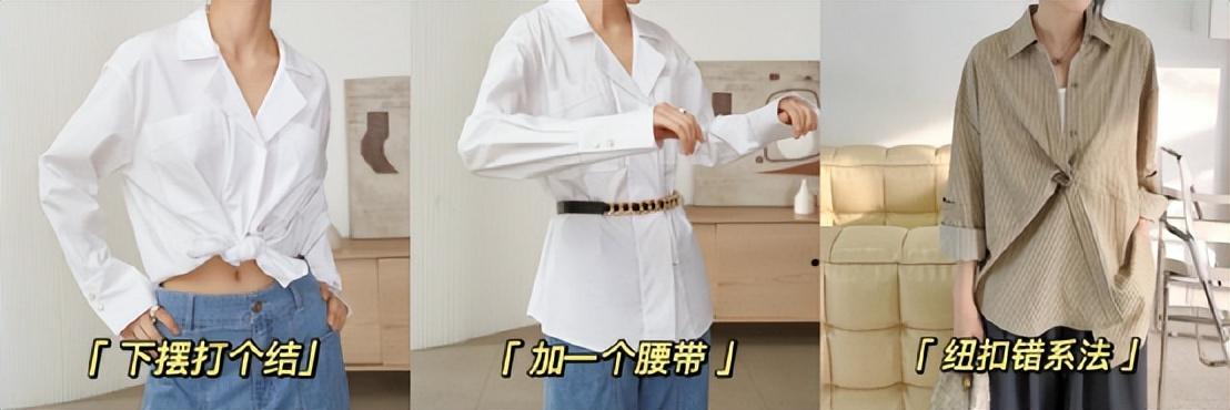 可以通过打结,增加腰带,错位系纽扣等等方法去打破一件衬衣的单调性,增加一个穿搭的看点。