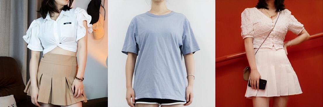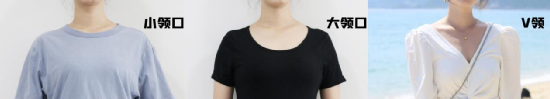 露肤度比较的还体现在领口上,小圆领、V领比小圆领看起来更加显瘦,大领口、V领的衣服能够在视觉上拉长脖颈比例,显得更加修长。
