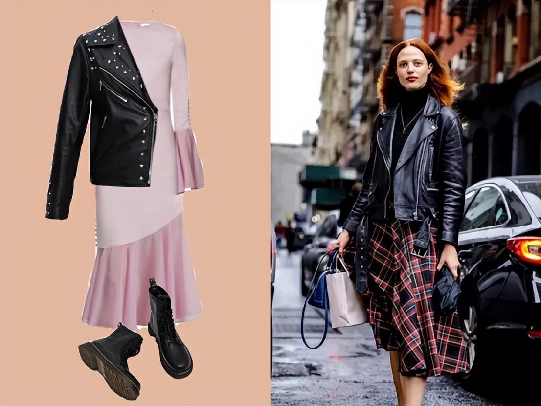 比如说皮衣本身就是本来中性硬朗的感觉,如果搭配裙装能有娘man结合的反差感,但如果搭配丝质感偏优雅气质的裙装,两种单品气质就不匹配,看起来就不和谐。还是应该搭配相对硬朗线条感利落的裙装会更加符合整体风格。
