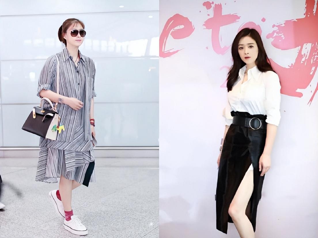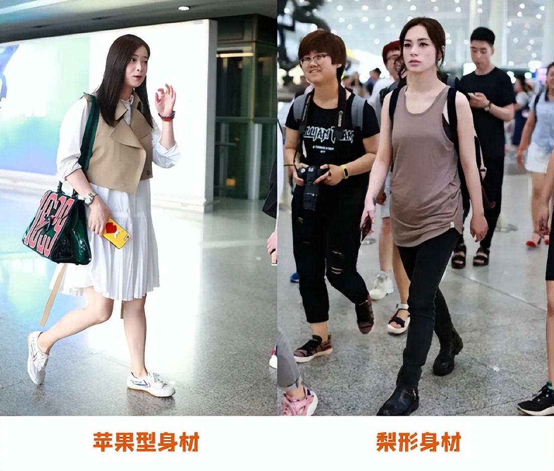 像蒋欣就是偏向于苹果型身材,而阿娇偏向于梨形身材,你会发现两种不同的身材,如果都穿比较宽大不凸显腰线勾勒身材曲线的衣服都比较显胖显壮。