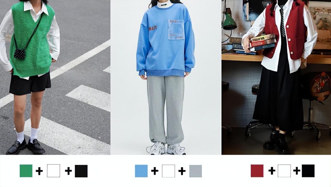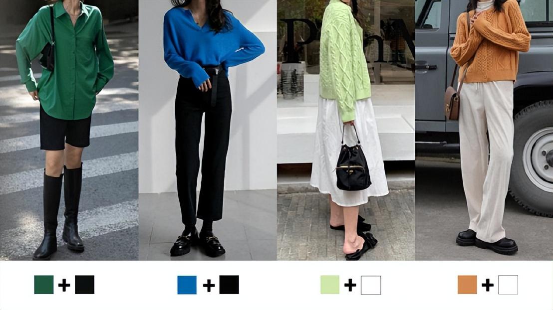 基础的就是白+彩色/黑+彩色,这样既能穿搭的色彩简单不出错,又能够有色彩的提亮,增加了整个穿搭的活力。