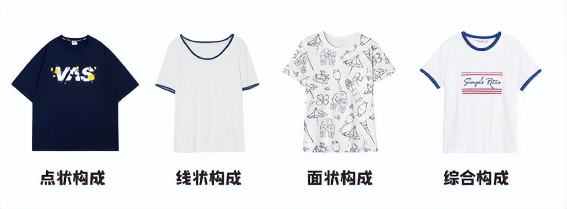 服装图案的组成大致有四种构成形式:点状构成、线状构成、面状构成、综合构成。