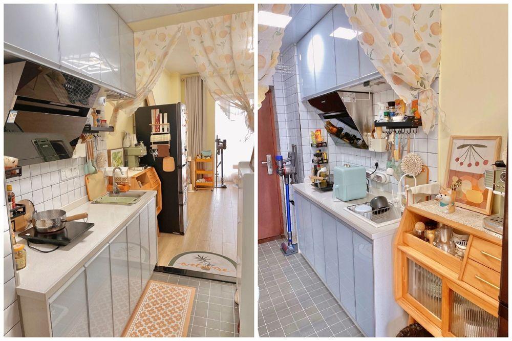 进入家中后,直接就是与玄关相融合的开放式厨房区域,这里空间相对来说比较狭窄,但姑娘却通过一字型的橱柜与吊柜,打造出集烹饪与收纳为一体的空间。