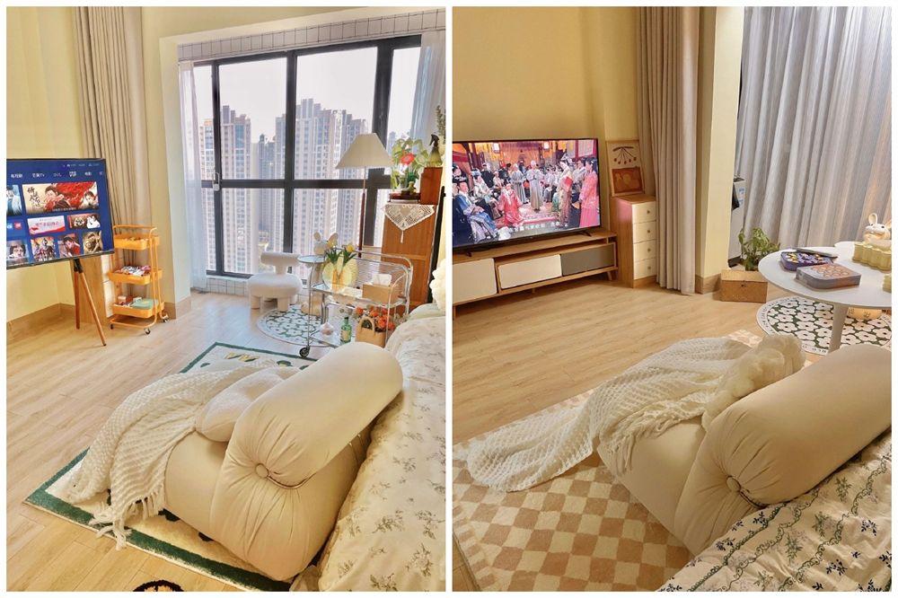 由于这位姑娘是独居,客厅空间基本上是属于她自己的休闲区,所以她也没怎么考虑到待客需求,只是用一张无腿的单人沙发,配合地毯和抱枕组成慵懒舒适的座靠观影区。