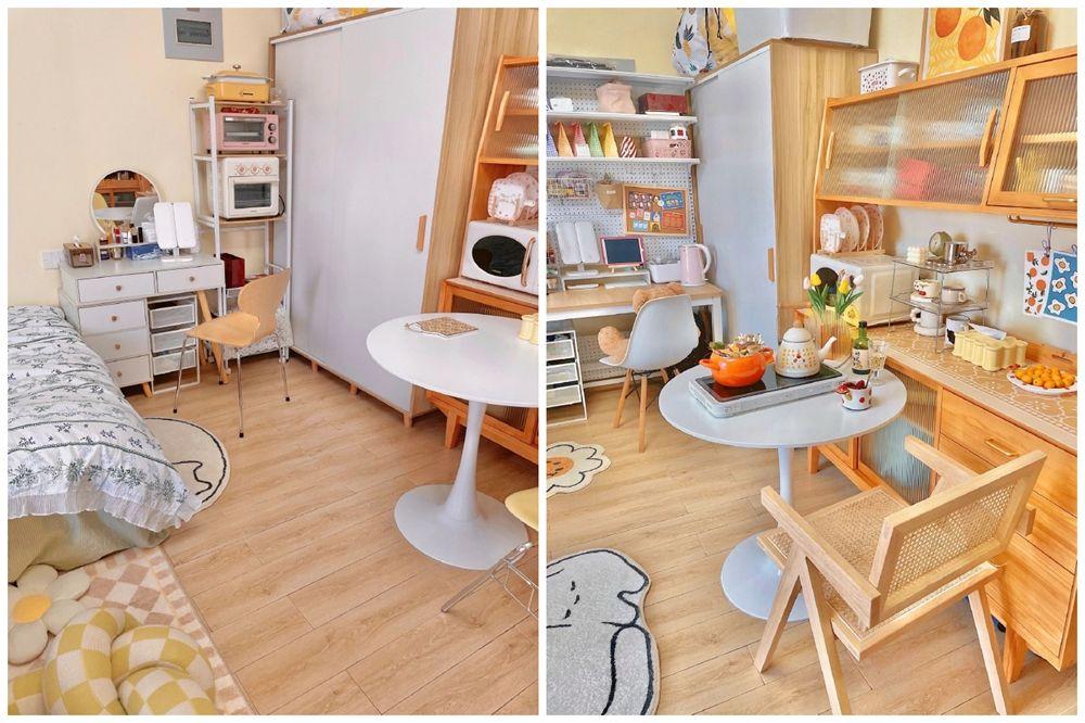 床尾的角落处,分别设计出了一个工作区和一个小小的餐厅,利用靠墙的的空间,摆放衣柜和大餐边柜,让姑娘的衣服和各种碗碟餐具、杯盏瓶盘有处收纳。