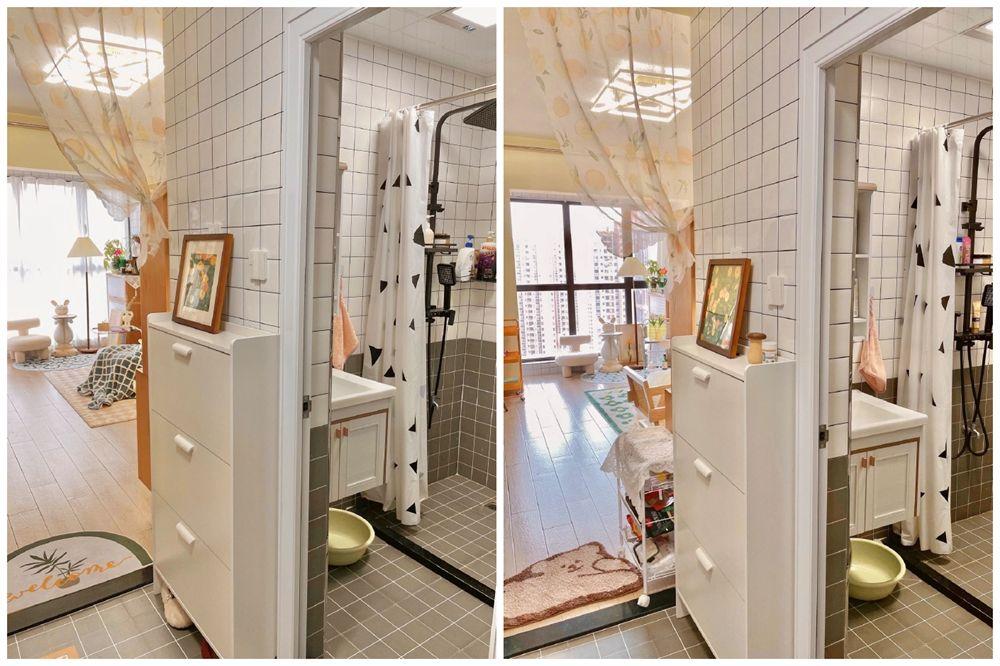由于一进门左手边做了橱柜,右手边通往小小的卫生间和浴室,所以只好在临进客厅前的位置,安装一组超窄的玄关柜,底部可以当侧开式的鞋柜,和换鞋区,顶部则可以随手放置钥匙、钱包等物,进出家门还是挺方便的。