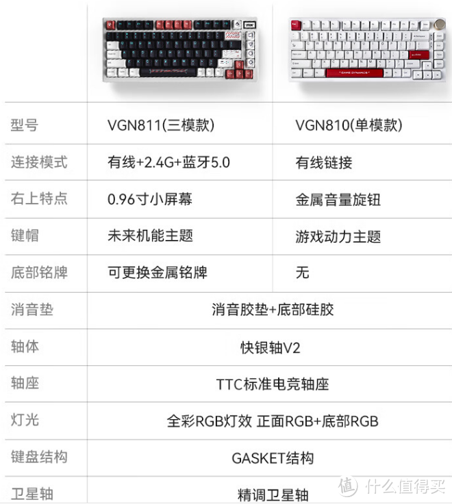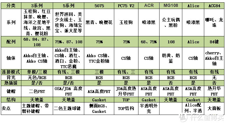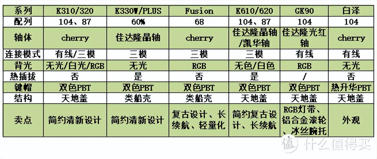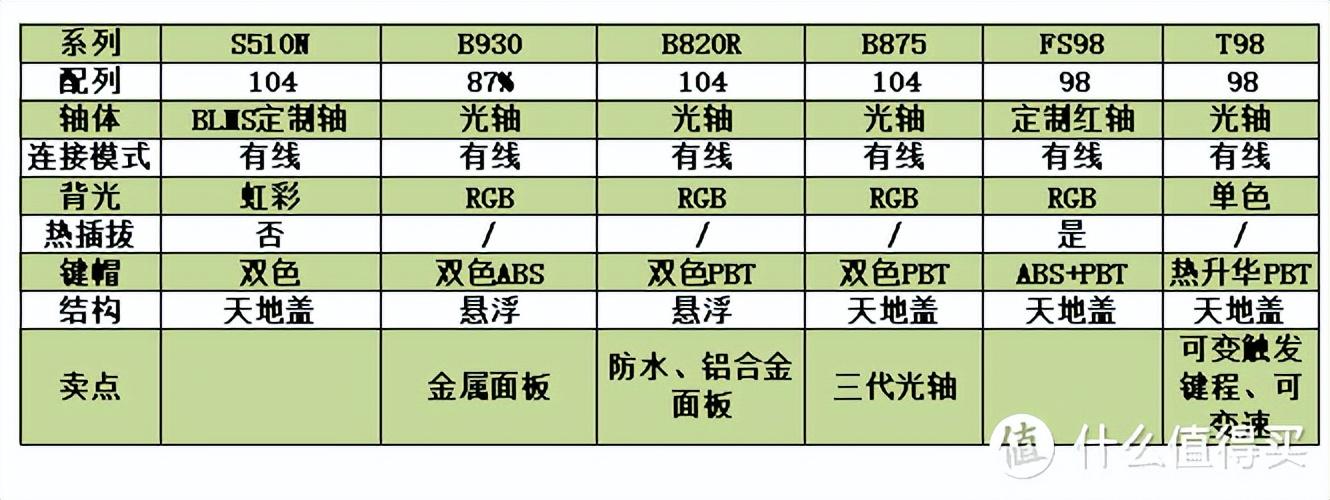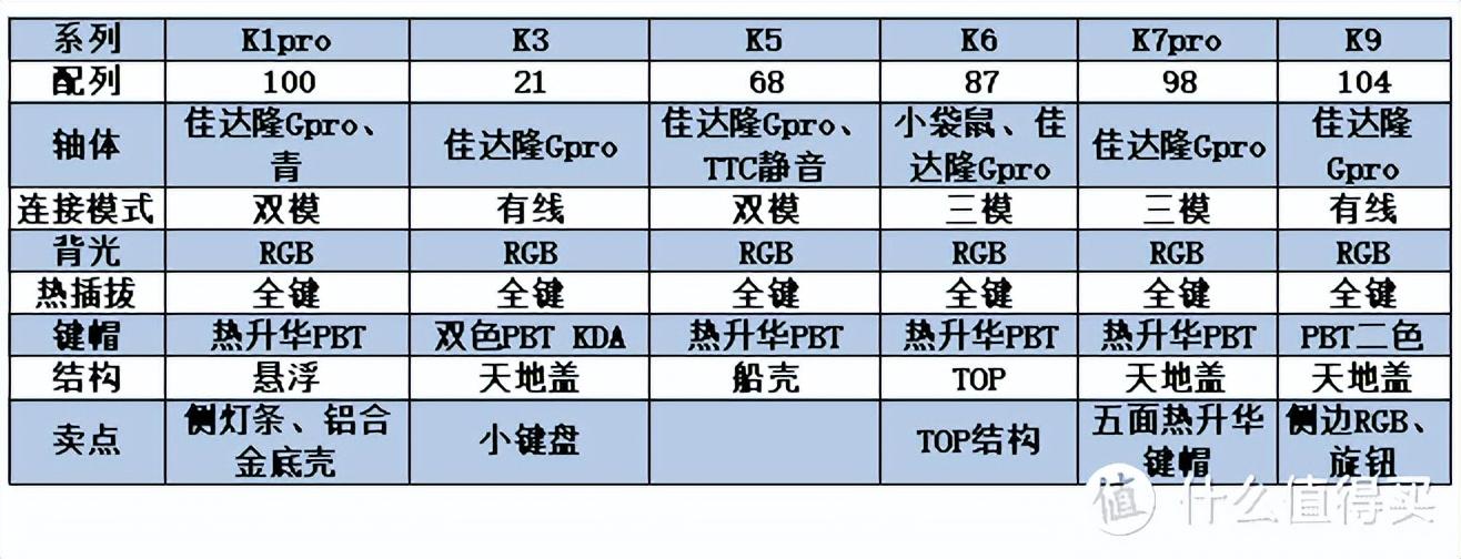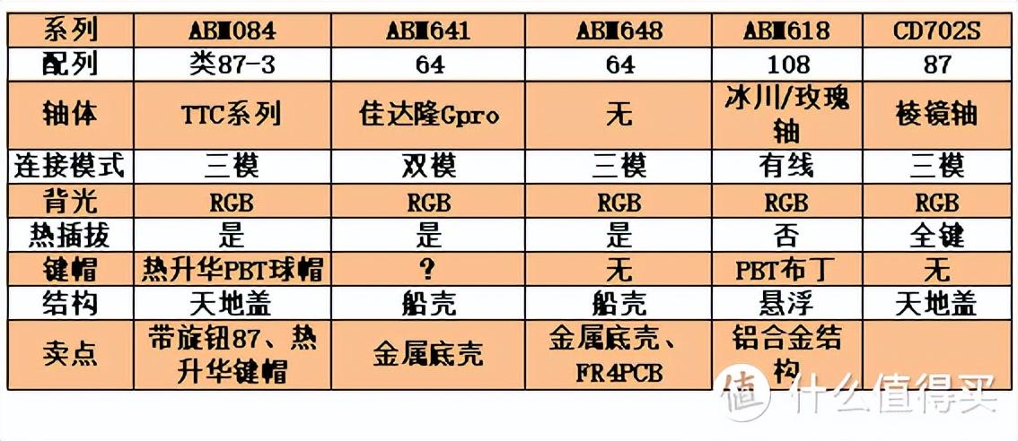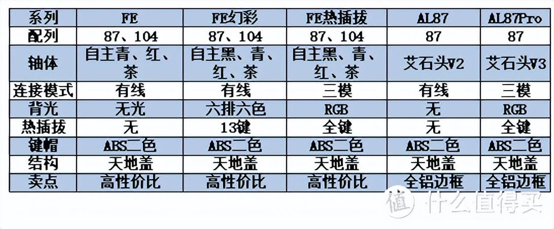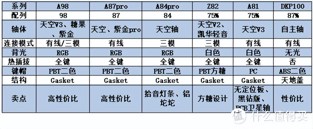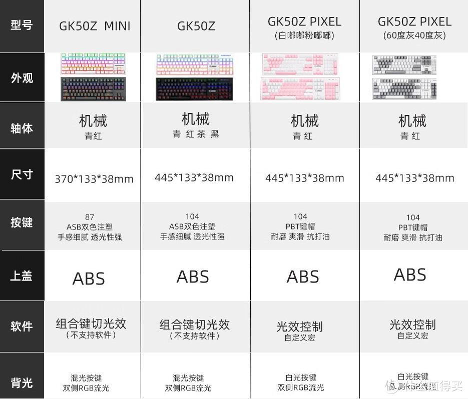 G50Z系列有87和104两种配列,高特轴体,两侧的RGB灯条比较有特色,具体的看下面这张表就行了,顺便说下,这张挂在产品页上的表格里吧ABS打了成了ASB还一直没换,是不是有点……另外低端款的背光是彩色混光,减分项。
