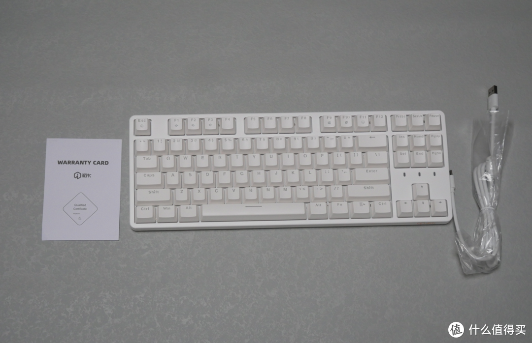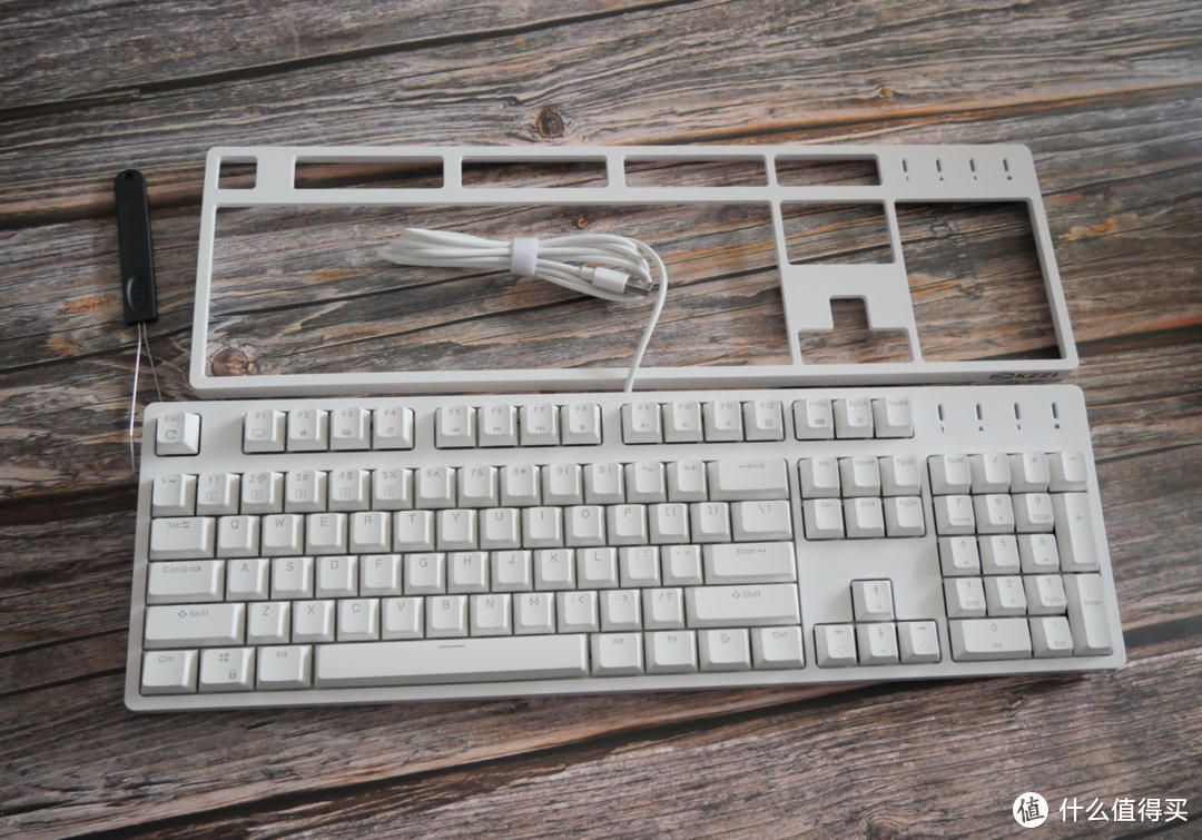 键帽采用了弧形倒角内凹的球帽,稍稍需要适应一下,不过实际拿它打字的时候并没有发生误触的情况,而且边缘是圆滑的,摸起来很舒服。没有RGB背光,但是白光其实更符合这把键盘的气质。