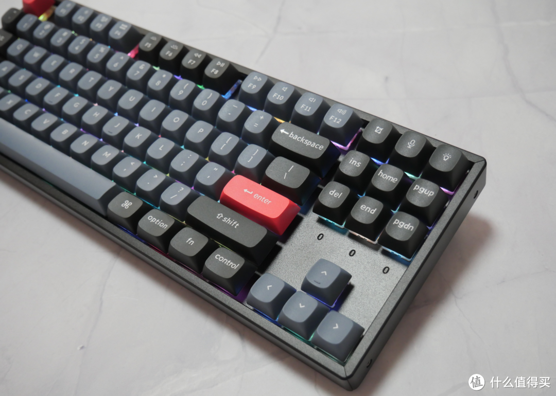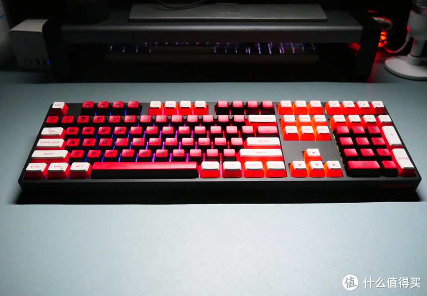 ②GMK1080:标准的108配列,不过这把键盘的设计语言是真的少见,这个语言可以算上是小语种了。官方也并没有给这个配色去命名,我觉得可以叫做熔岩配色或者火山配色。我这把是BOX红轴,手感也还挺有特点的,大键没有大问题。