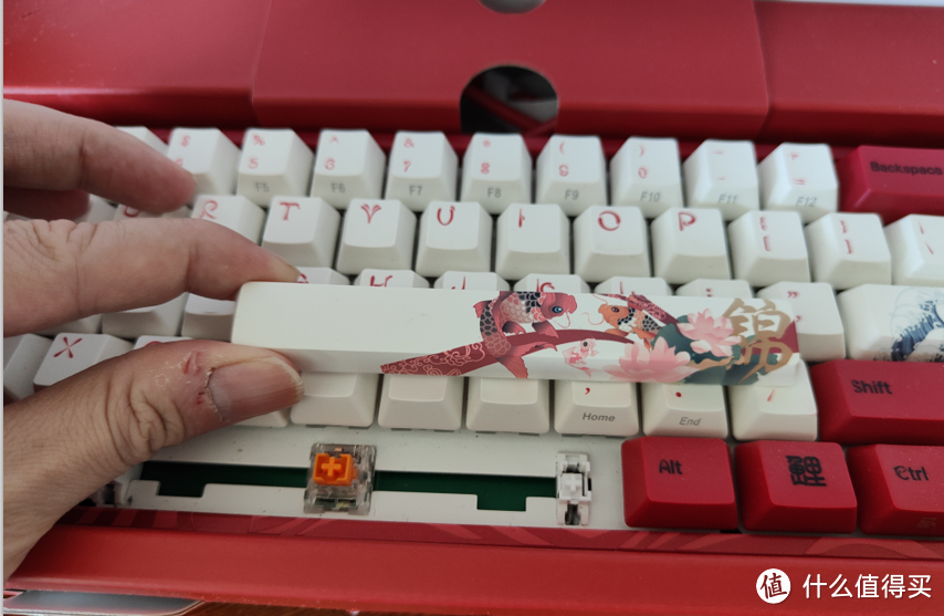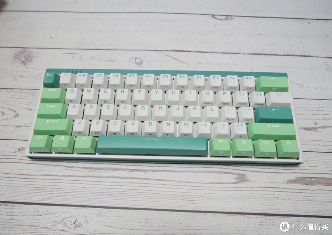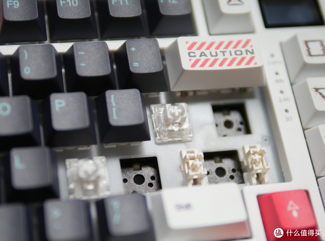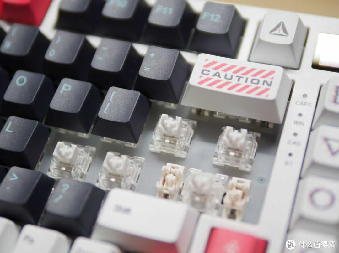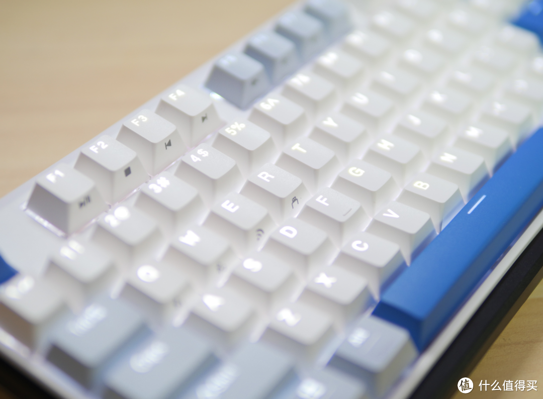 这把键盘大概有20颗键帽使用了五面热升华工艺,空格平整,完全没有跷跷板。F区的键帽质感和主键区不一样,是光滑触感,