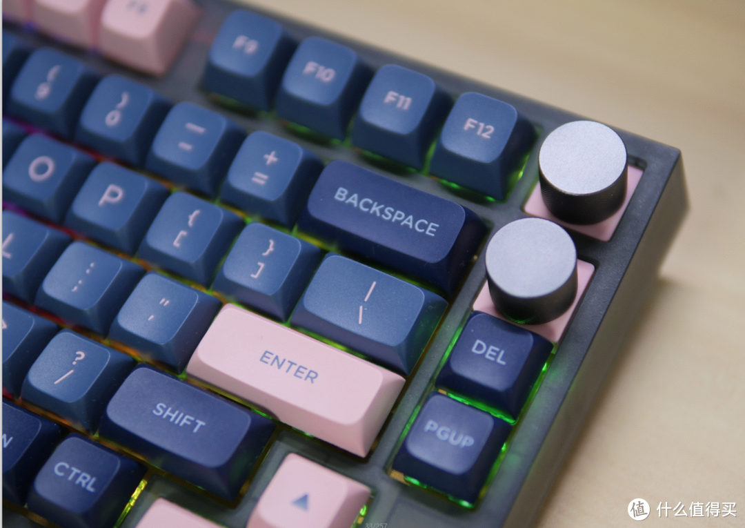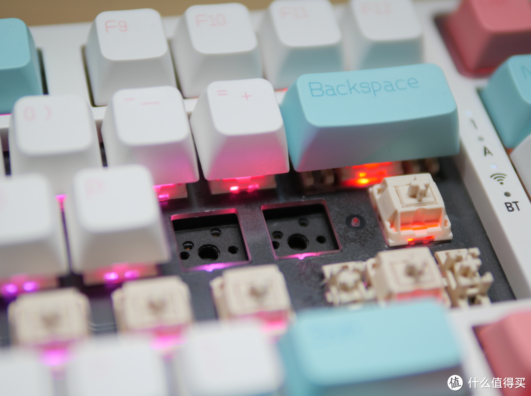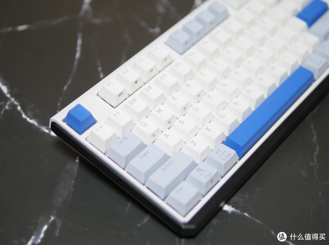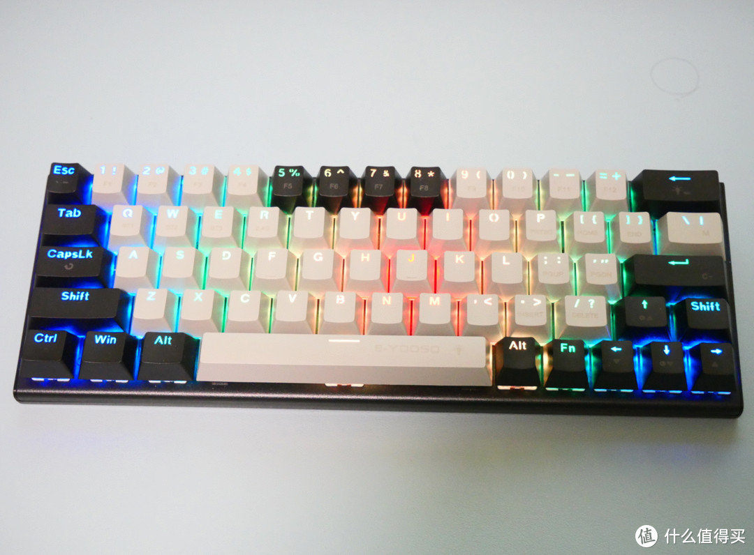 二色的键帽的透光度不错,不过表面有点偏光滑,有点担心耐磨度且个别键帽有注塑瑕疵,比如右侧shift字符周围的的白色会和整个键帽有一定色差,不过这个价位也难以要求更多了。