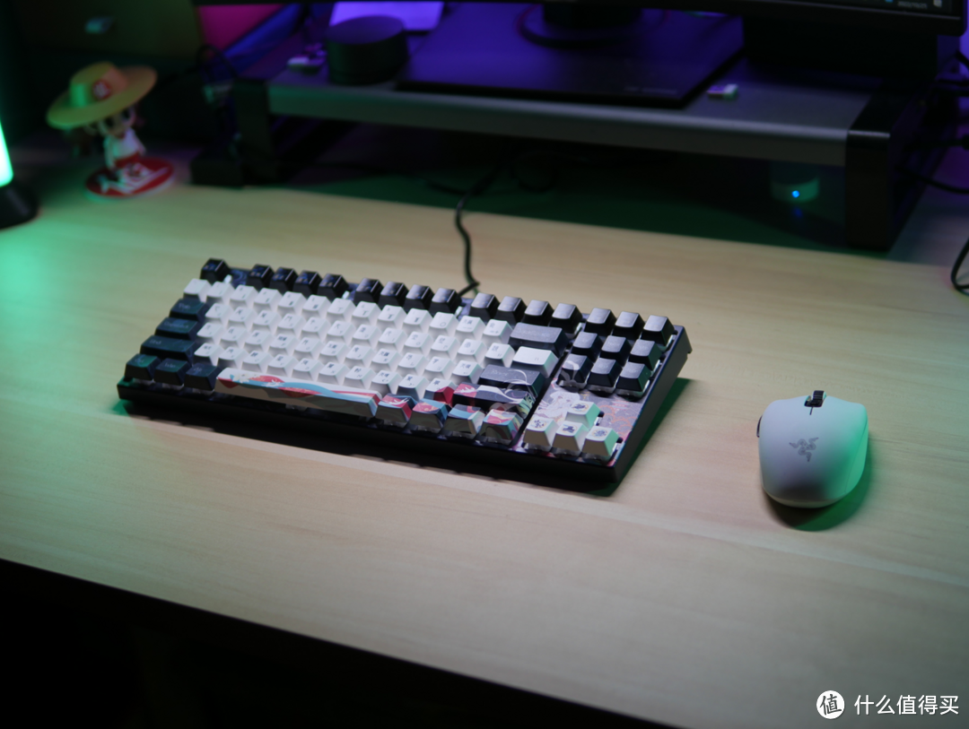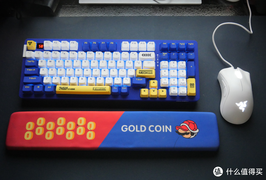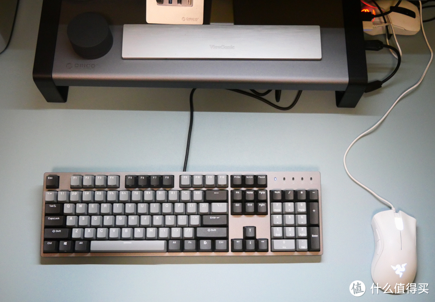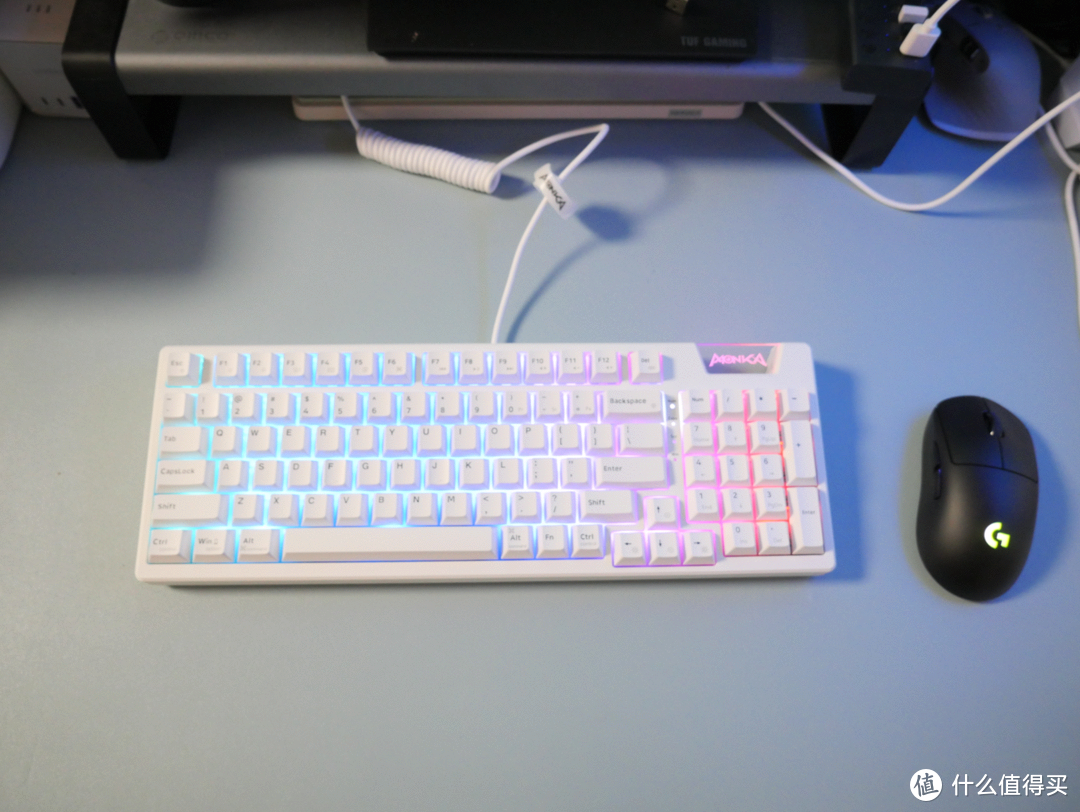 小米目前为止只出过这一把机械键盘,采用的实际上是船壳设计加了两个塑料盖子做分隔,高特的轴体,和前面的微星一样,不过背光是白色的,还比较容易让多数人接受。
