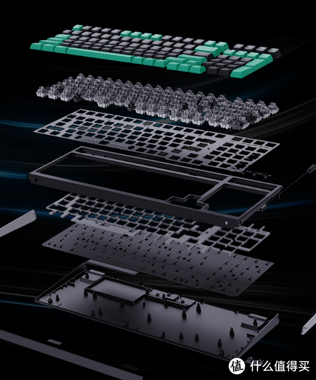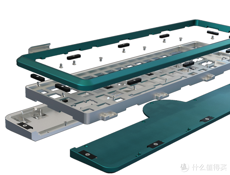 近年流行的标准98键位设计,去掉了个别使用频率偏低的按键(毕竟要规避专利),加上了音量旋钮,Gasket结构,凯华的全POM材料MX冰激凌轴体。填充材料不是EVA、不是硅胶而是实实在在的Poron棉,轴下垫同样也配齐了。