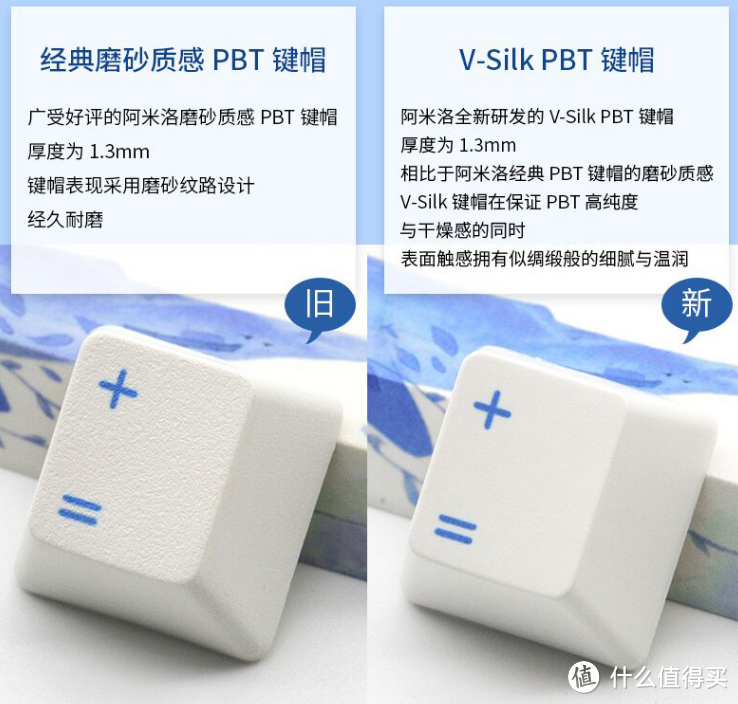 键帽算是阿米洛的精髓,热升华键帽除了可以做出更好看的团,另外耐磨度也好于大部分的二色键帽。后来推出了V-Silk PBT键帽在表面纹理上做了调整,手感更舒适。基本上阿米洛近期出厂的产品已经都更新键帽了。