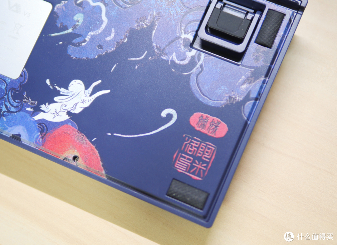众所周知,阿米洛的主打卖点就是静电容轴体和漂亮的高品质热升华键帽,这把嫦娥当然也是在这两个卖点下开发出的一款全新键盘。除了在键帽刻字上使用了类似花旦娘的古典汉字设计,在整个键盘套件的正面和背面还印上了奔月壁画,这几乎可以说是阿米洛有史以来键盘上图案做得复杂且精细的一款键盘。