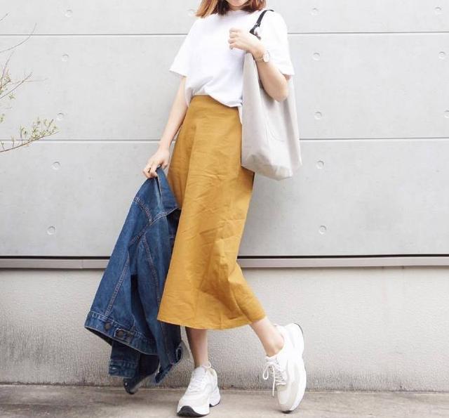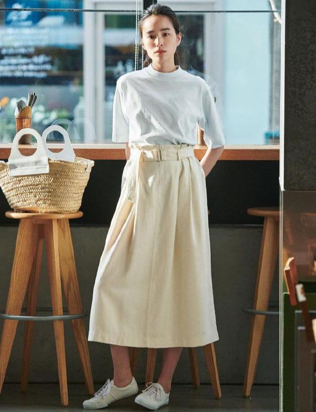↑很喜欢卡其亚麻半裙,它有着的花苞腰头,同时版型呈A状,宽松垂下,自然放松。这样的舒达自如和亚麻材质匹配,是夏天的搭配。