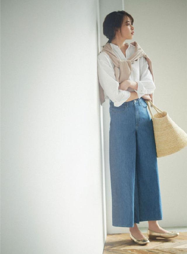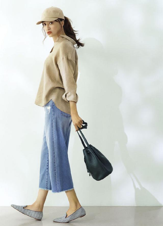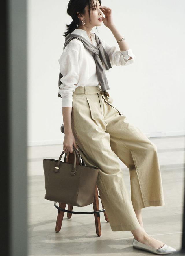 ↑经典的卡其色阔腿裤,随便穿错不了。与它配的还要属白色,白色T恤、衬衫,想要层次感,叠穿一件在肩头,谁看你都透着时髦。