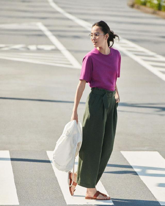 ↑魅惑紫配上绿色亚麻阔腿裤,在鲜艳的颜色中找出口,简洁中有着大时髦。这样的配色谁不爱呢?