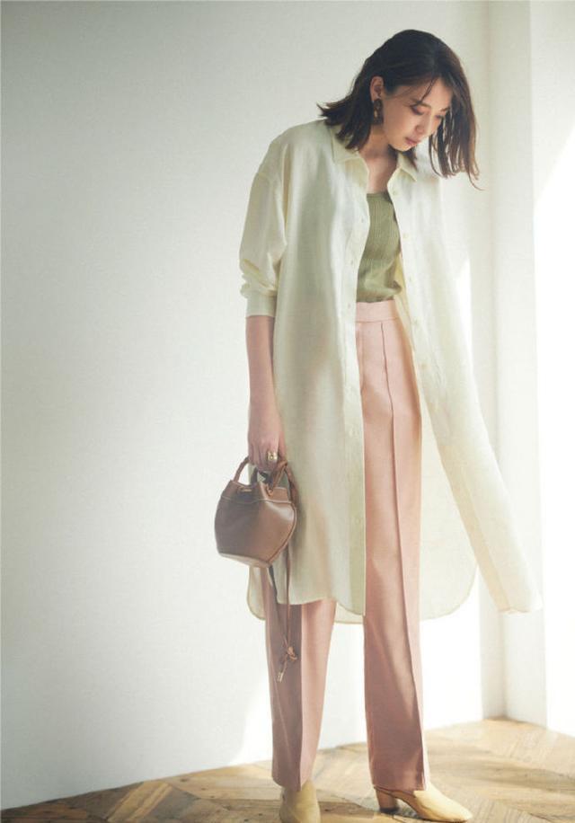 ↑一件白色的亚麻长衬衫,内搭浅绿小背心和淡粉烟管裤,清爽又美好。这样文艺知性优雅的装扮很适合有品位、挑剔的朋友。代表着浪漫少女心的粉裤子在亚麻的材质中也被传染上温和气息,不会过于显幼稚。