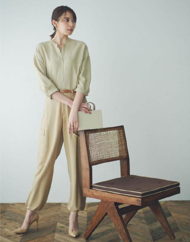 ↑米色小v领衬衫配上深一些的卡其色裤子和同色高跟单鞋,简单清爽又美好的样子太让人喜欢了。如果肤色比较深,可以选择再浅一点的米色,接近白色类,就可以化解显黑问题了。