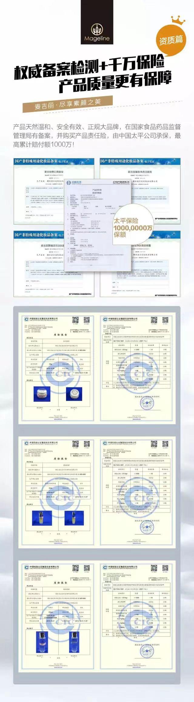 麦吉丽生产中心拥有全自动的高科技生产设备和生产环境,灌装设备应用气动装置,实现无接触、无菌操作,并实施ISO9001-2000标准质量管理体系,旗下所有产品从研发、实验、生产都严格按照相关法律规定执行,产品自原材料进厂至成品出厂,整个生产过程多要经过100多道检测,生产车间采用药品生产的洁净标准,生产过程全自动,避免人体接触及异物污染。并已通过食品药品监督管理局备案,中国质检集团认证,太平保险1000万投保,产品有,以品质服务高端消费的女性。