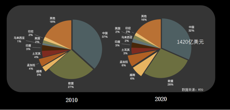 毫无疑问,我国是大的服装出口国。根据世界贸易组织的统计数据,2020年,我国的服装出口总值1420亿美元,占31.6%的市场份额,已经连续十年位居首位。