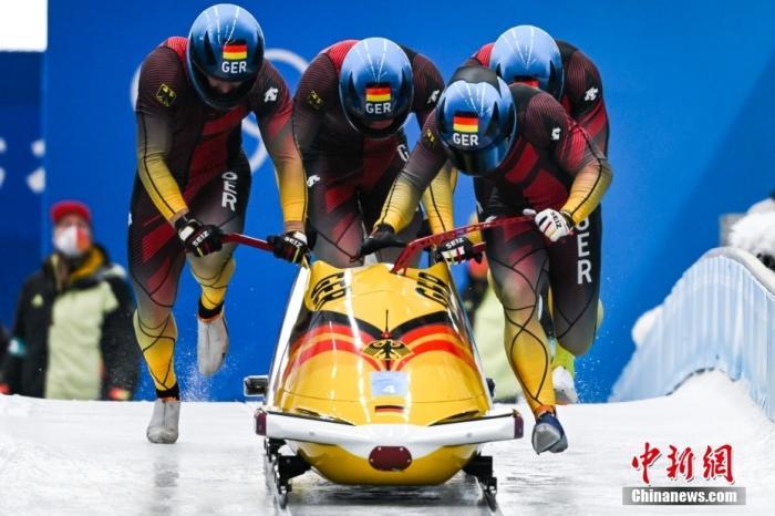 2月20日,北京2022年冬奥会四人雪车比赛在雪车雪橇中心举行,德国队的弗朗西斯科·弗里德里希/托尔斯滕·马吉斯/坎迪·鲍尔/亚历山大·许勒尔以3分54秒30的成绩获得。图为德国队选手弗朗西斯科·弗里德里希/托尔斯滕·马吉斯/坎迪·鲍尔/亚历山大·许勒尔在比赛中出发。 中新社记者 何蓬磊 摄
