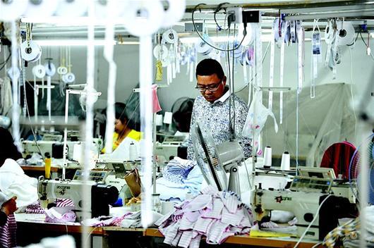 图为:在沙市岑河一家童装厂内,质检人员在车间内抽检成衣质量。(记者陈迹摄)