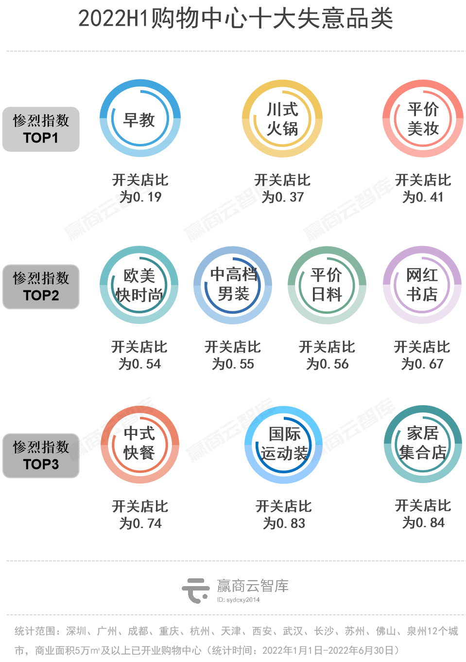 而以开关店数据为划分维度, 上半年失意的十大品类“惨伤”程度,排名如下 :