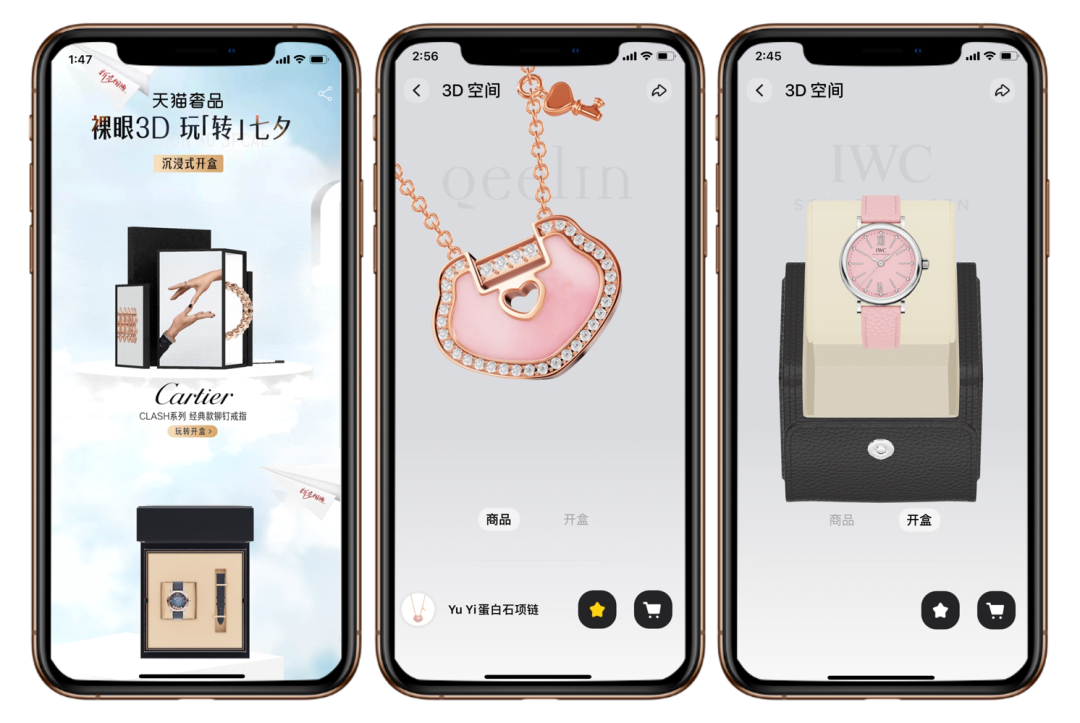 譬如今年七夕,卡地亚Cartier在3D会场展示了一款CLASH系列经典款铆钉戒指礼盒,消费者点击商品可以在3D空间放大、缩小查看产品细节,堪比真实“开箱”。一些腕表品牌还能展现礼盒打开的过程,以及收到礼物的人看到礼物第一眼的样子。