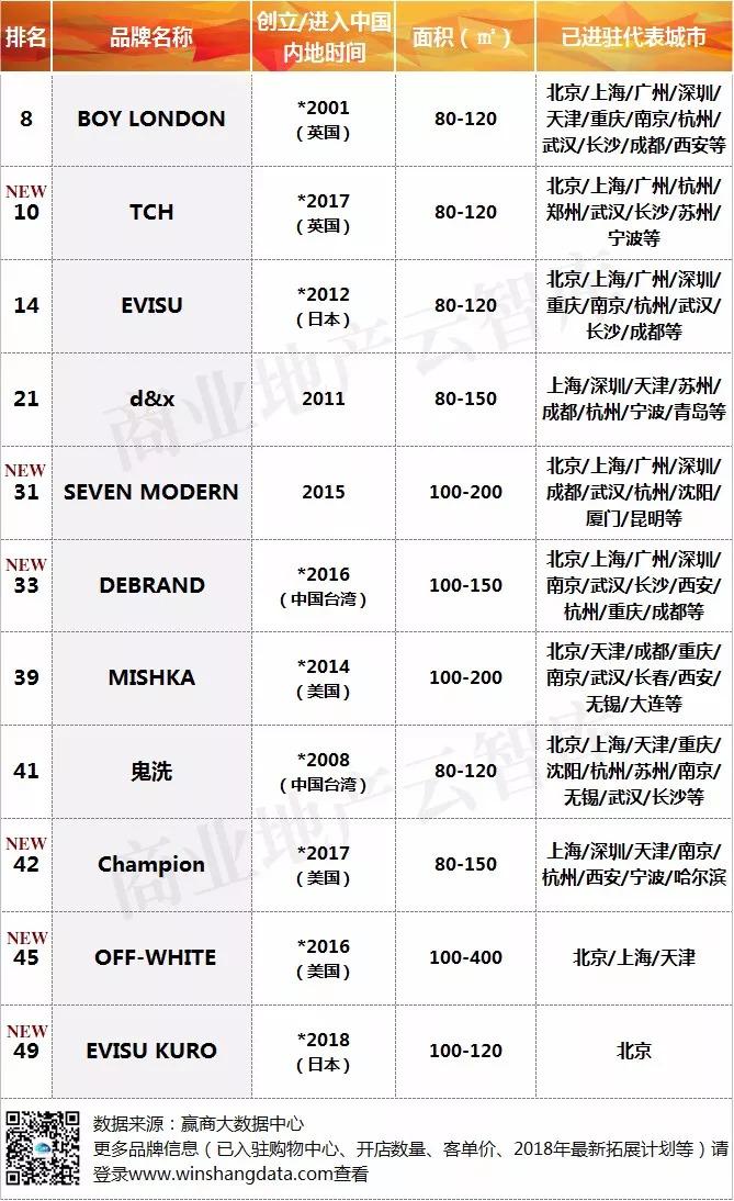 注:本榜单中带*年份为品牌进入中国内地时间,带有“NEW”表示品牌为近三年进驻中国内地购物中心的新兴品牌(下同)