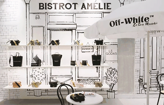 多元经营模式:2018年巴黎时装周期间,OFF-WHITE在Le BonMarché 百货内开了一个期间限定咖啡馆。除了贩售经典口味的咖啡与部分限定品牌商品,更配合时装周推出了抹茶味爆米花和名为Blue Magic的蓝色水,以及一系列果汁与功能饮料,称为“巴黎时装周生存包”的特别组合。