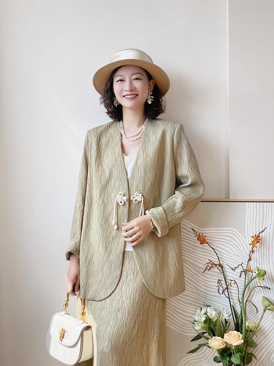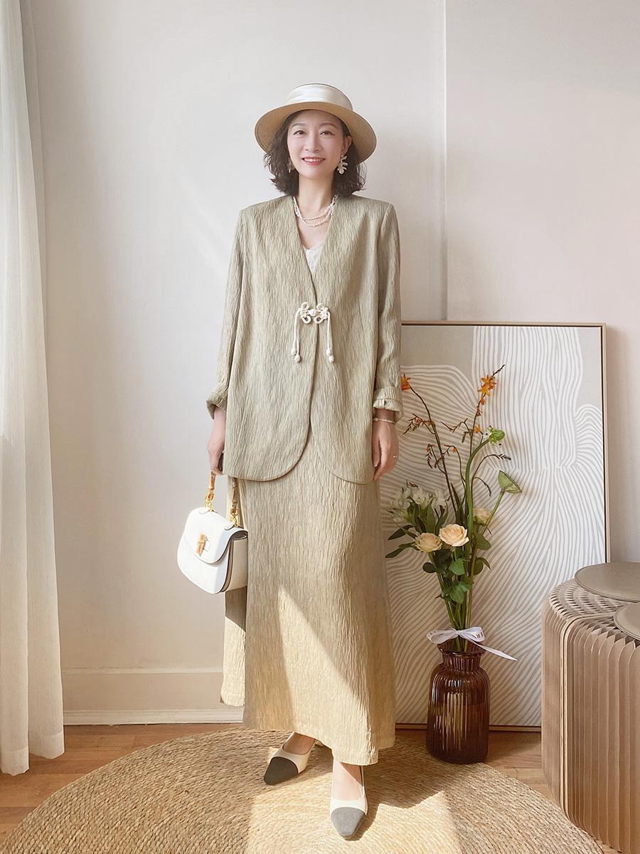 第十四套:盘扣宽松提花优雅西装+半裙中年女性可以多试试这种复古的新中式套装,真的有气质,很显年轻。