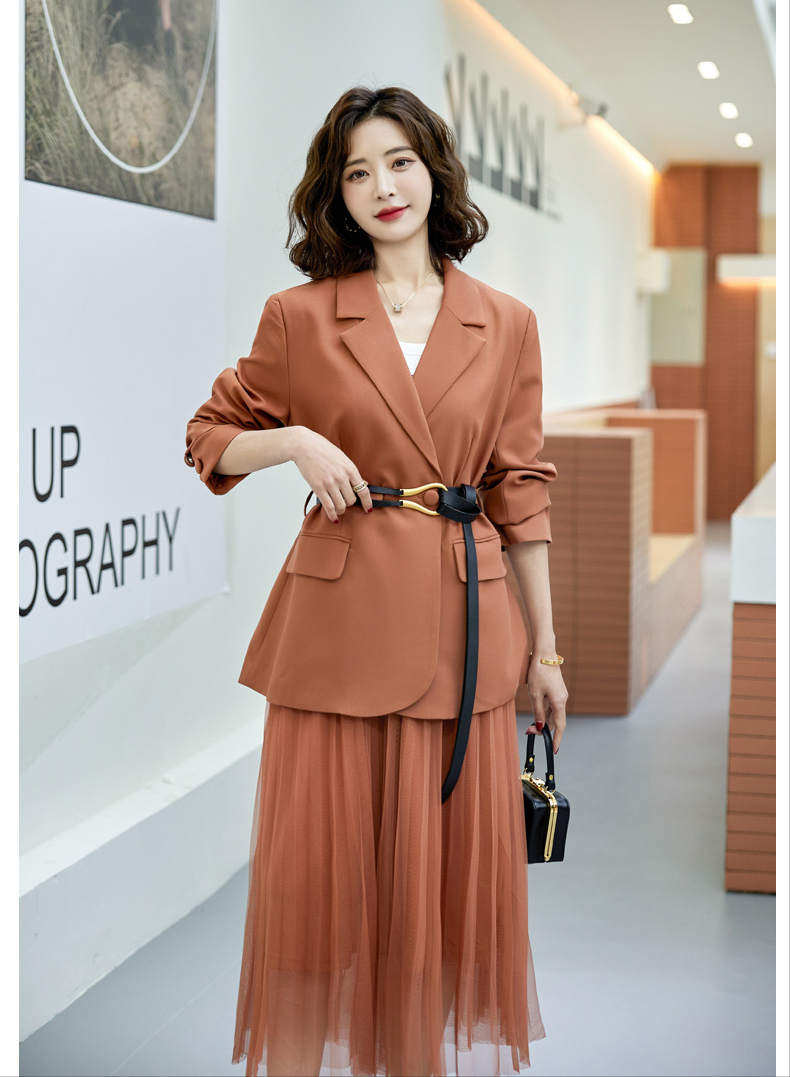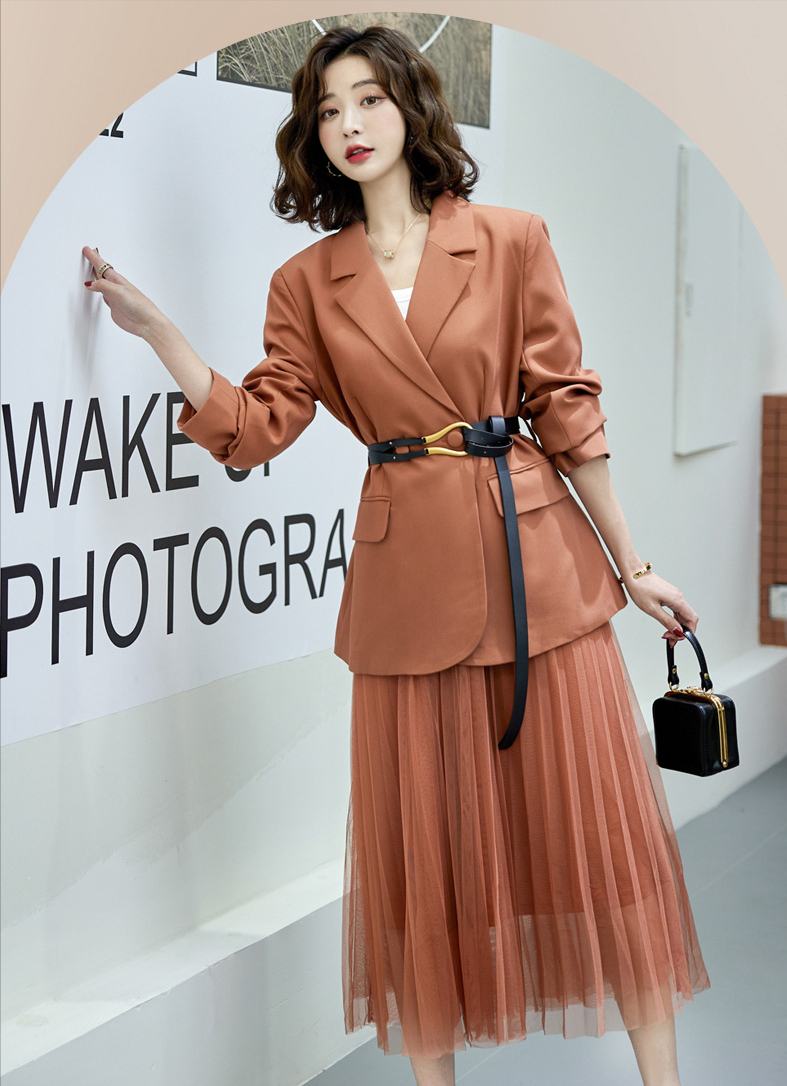 第九套:西装网纱半身裙两件套秋日穿出好气色,那就来一套这个气质西装百褶裙通勤套装吧,枫叶的配色带有一点复古橘色了,色调上显白。