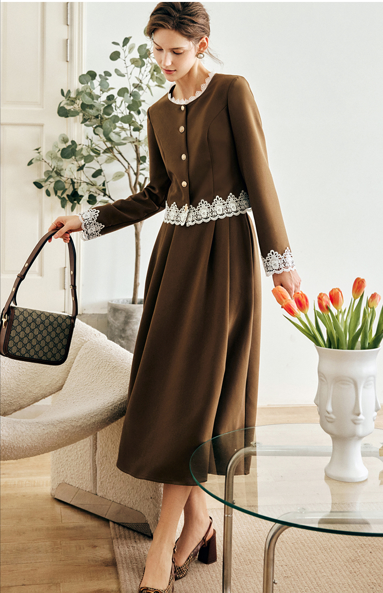 第一套:咖色花边小香风两件套我真的太喜欢这个咖色的套装了,简直很有法式女人的味道。气质的圆领+拼接花边,细节之处真的精致,整体也是优雅时髦,立体层次感很强。