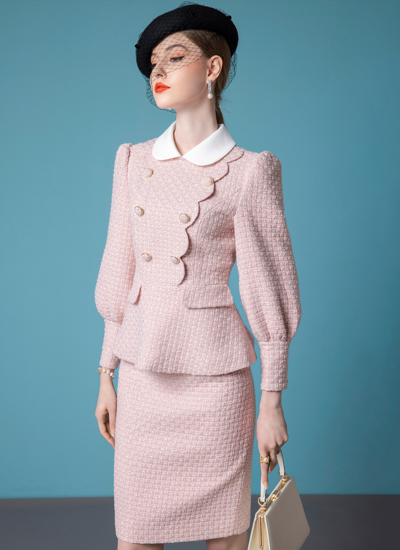 第三套:粉色甜美粗花呢套装裙这一套很温柔,浑身上下透着清新淡雅的气息,温柔的樱花粉配色,加上 白色的小翻领,浪漫的气息扑面而来,整体的调调是比较甜美的感觉,灯笼袖+花边剪裁,在视觉上有体量感,手臂也很遮肉,起到显瘦的作用。