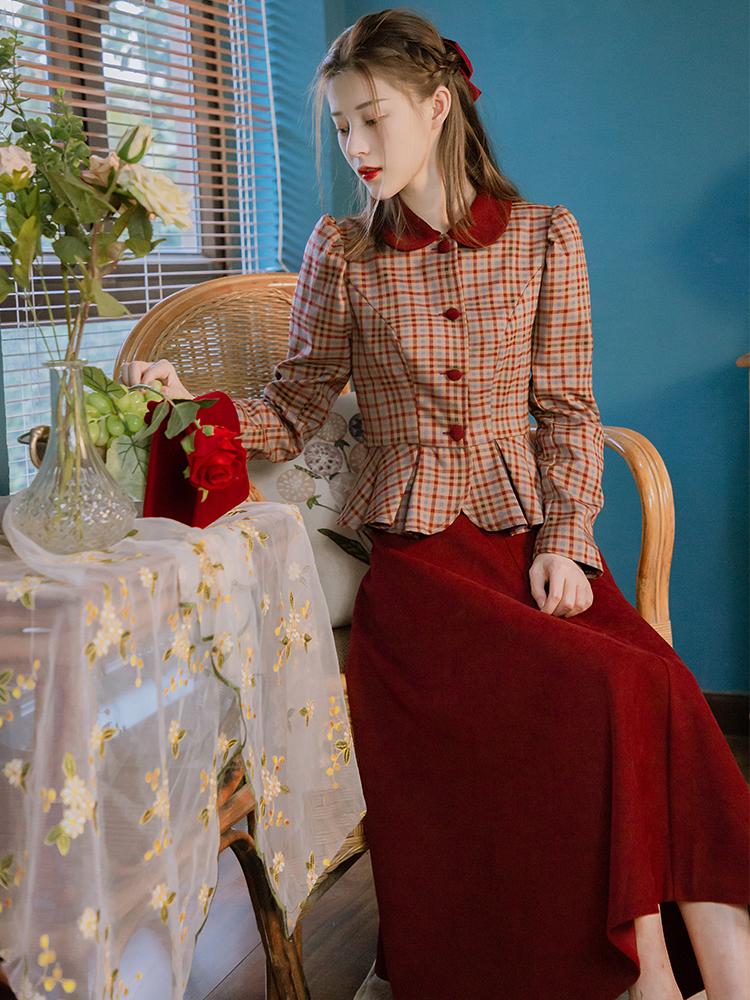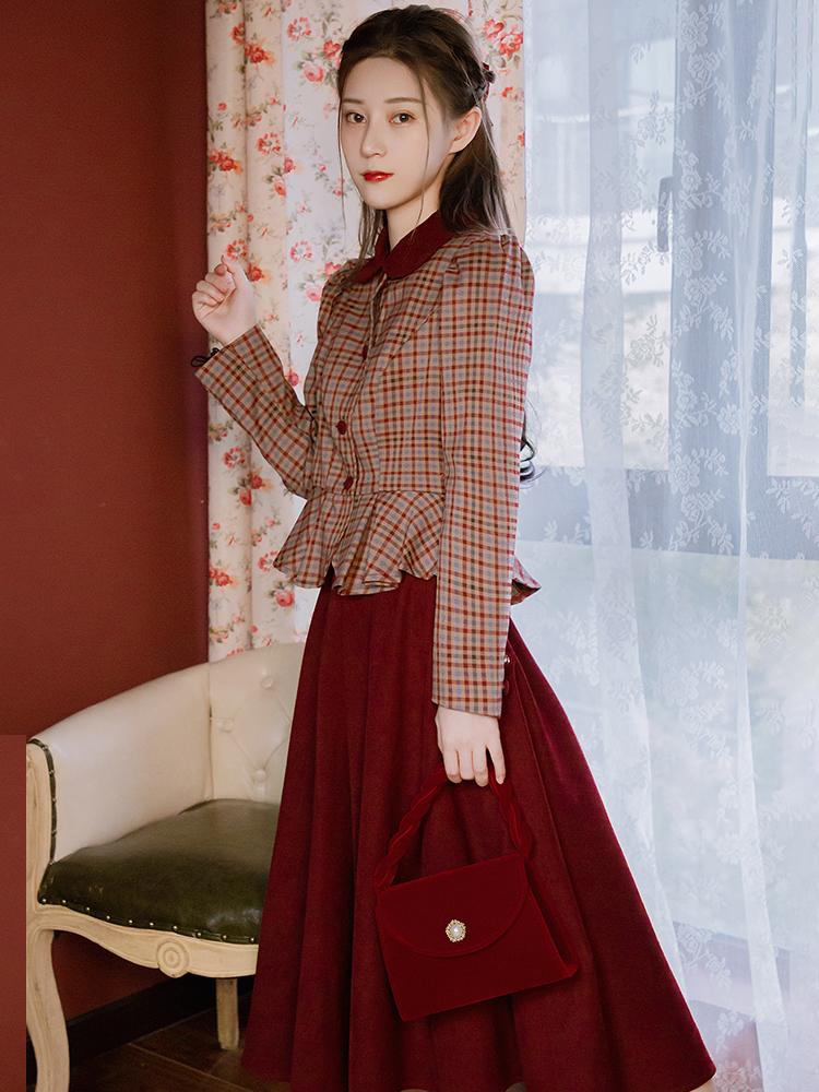 第五套:复古红色宫廷风两件套装这个套装的配色好看,很有复古的味道,酒红格纹很有温柔又气质的颜色。