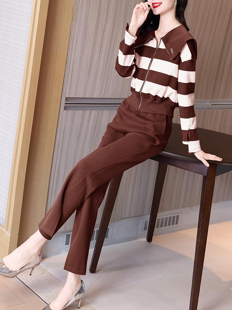 第十八套:休闲卫衣开叉裤子两件套条纹撞色设计,时尚有洋气,大翻领也减龄,有点类似卫衣的款式,这种组合,适合大多数中年女性哦。