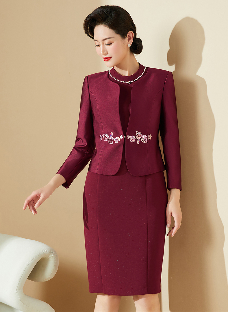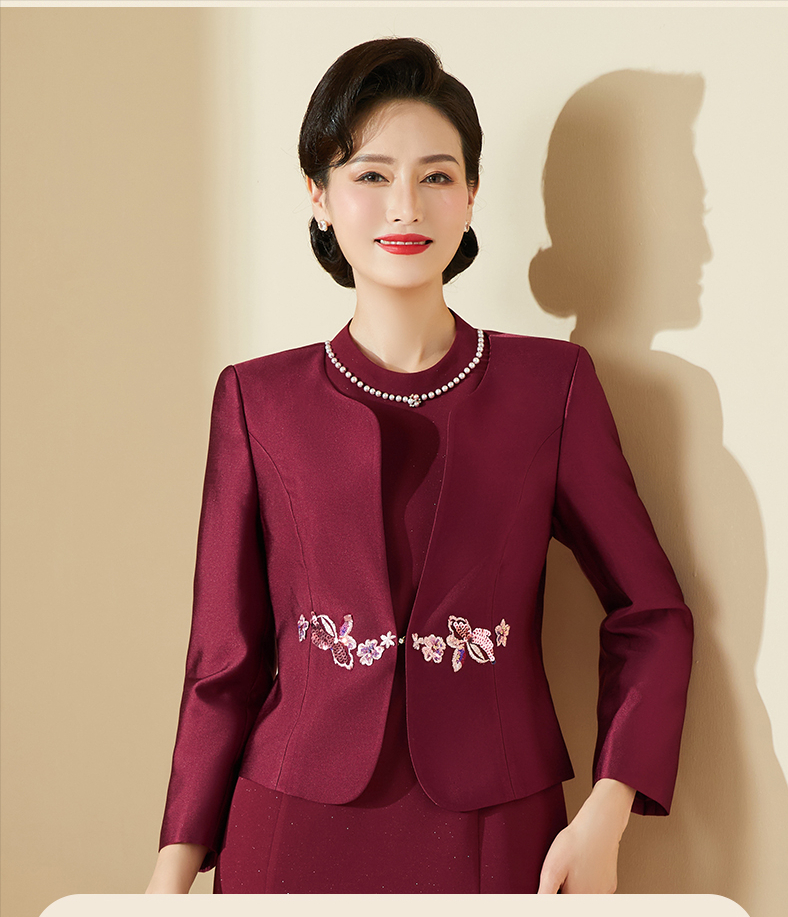 第十五套:酒红色礼服妈妈两件套从容优雅的感觉,从着装开始,选择一套舒适好看的套装穿搭,这套可以作为正式场合礼服来穿,比较有气质,浓浓的高级感。
