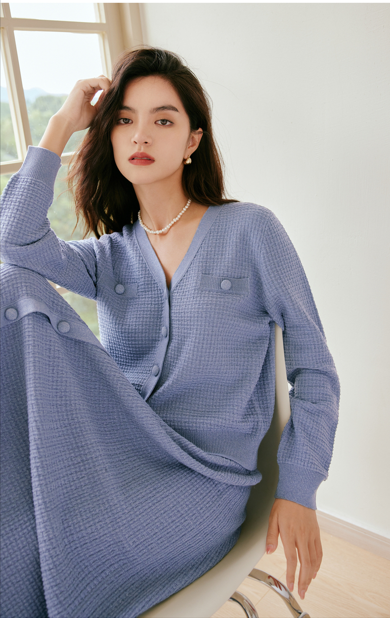 第十套:紫色温柔v领针织裙套装针织套装适合职场穿搭,也适合日常休闲,可谓是两者都相宜。