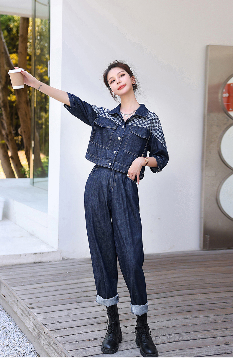 第二十套:牛仔工装两件套这是另外一组牛仔工装风格的套装,格纹牛仔元素,带有视觉上的冲击。宽松的上衣+阔腿工装裤,时髦气质两不误。