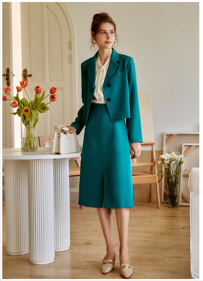 第六套:蓝绿色西装裙子两件套职场女人必选的西装半裙套装组合,同款短款H型西装外套+半裙的组合,利落又大方,高腰直筒开叉半裙,优雅迷人,轻松拉长下半身比例。