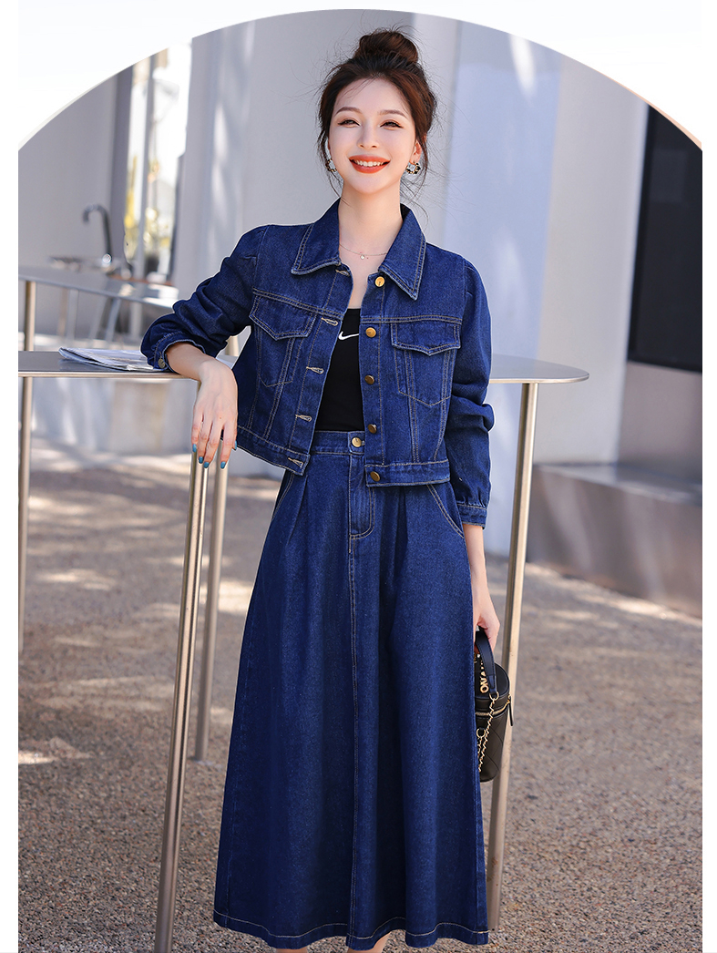 第十九套:牛仔套装两件套牛仔面料的套装组合,这几年很流行,自带一种复古休闲气质。一般比较容易搭配有短款牛仔外套+牛仔半身裙的组合,时尚有减龄。