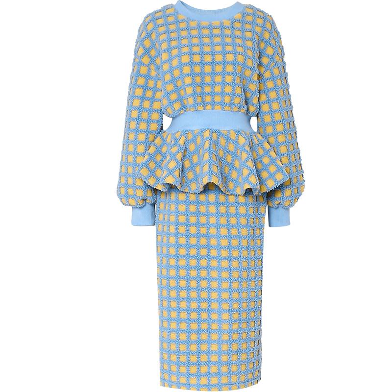 第十三套:蓝色织毛衣+包臀鱼尾裙两件套针织套装也能穿出优雅的感觉,选择这种色调比较纯正蓝色,利用“上松下紧”的穿搭守则,宽松毛衣+包臀鱼尾裙的组合,简单纯光面的款式就能很有女人味。