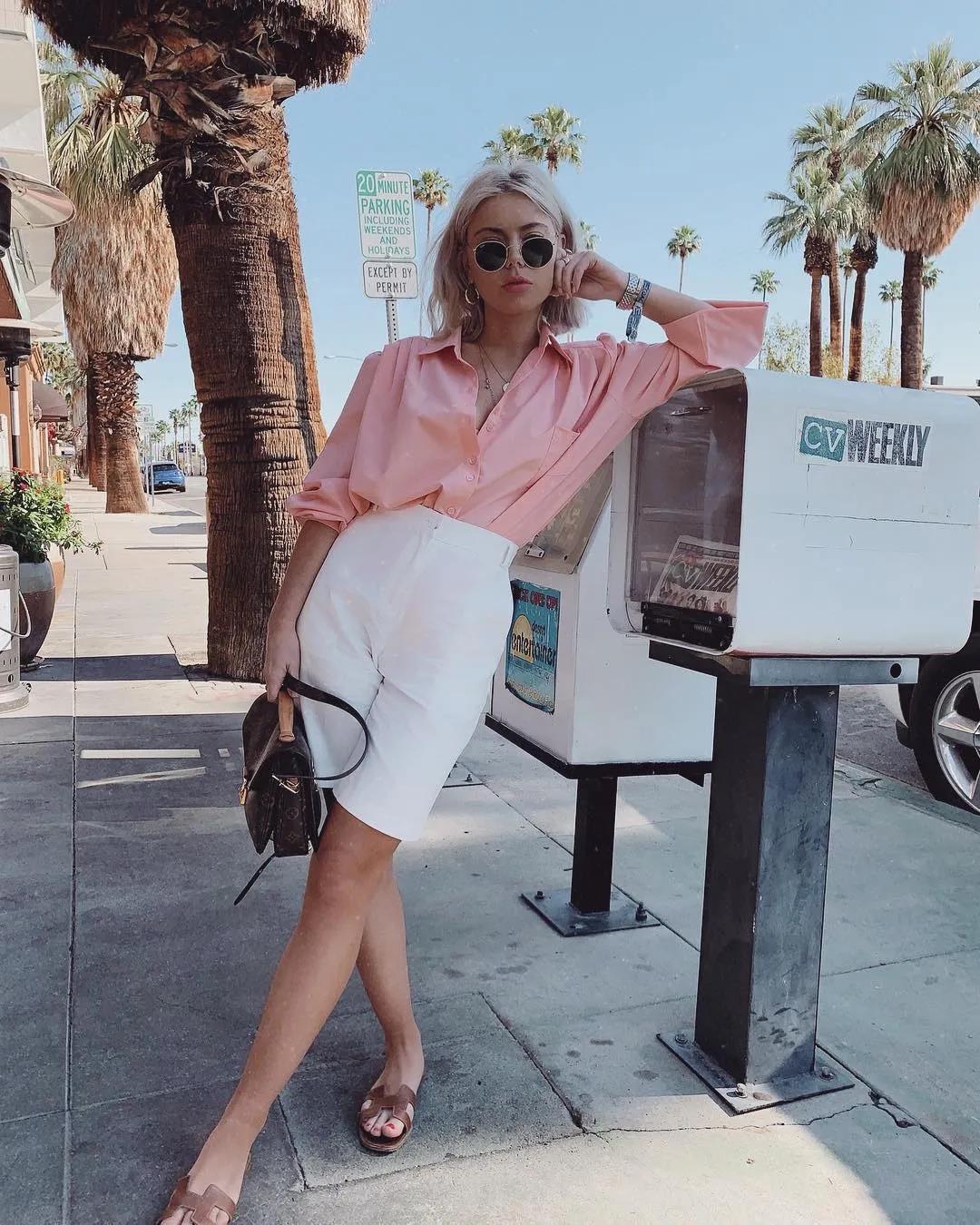 甜美的粉色上衣,简约时尚而且还自带三分的气息,不管是小女生或是大龄妹子们都的喜欢。将衣摆全部的扎进白色短裤里面,显得身材更佳,而且还流露出纤细的双腿出来,搭配棕色凉拖鞋,轻松穿出满满的休闲气息来,拿上一个精致的手提包,轻松穿出自己的别样风采。