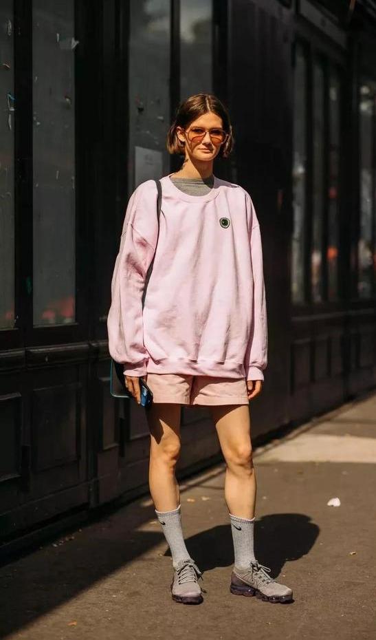 粉色卫衣清新而又减龄感十足,宽松的版型在内里搭配了一件灰色的小衫穿着,显得层次感百分百。下身的短裤版型很宽松,对于腿型也是一点没有限制的。脚上灰色长袜和鞋子的组合,协调感十足,搭配一个斜挎小包包,可轻松穿出满满的青春活力气息来。