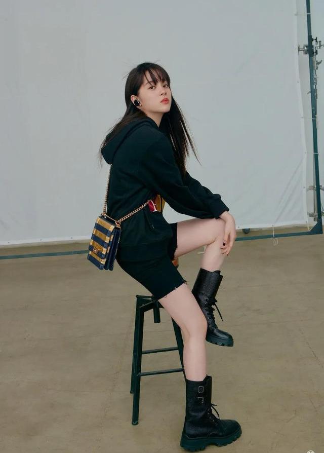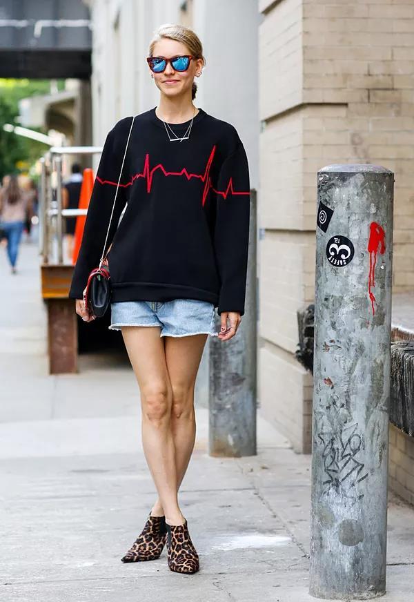黑色的长袖卫衣,会显得肤色很白皙,带有一点红色线条的点缀,显得时髦又洋气。宽松的版型,一点也不挑身材,穿起来舒适而又自在感十足。下搭的牛仔短裤与之搭配起来,显得俏皮感满溢,一双豹纹跟鞋洋气感满格,背上一个斜挎小包包,可以很好的穿出整体的时尚感觉出来。像这样的穿搭,在妹子们的日常生活里面,也是的常见的。
